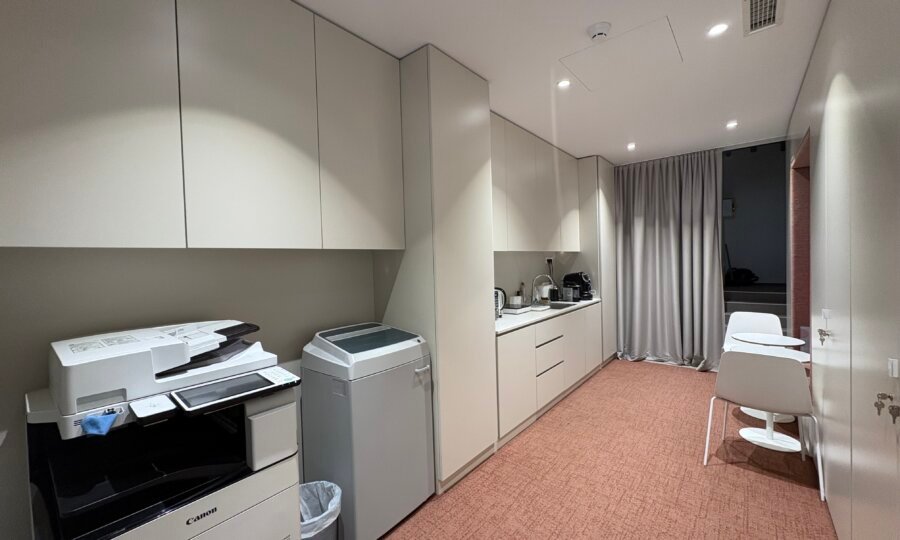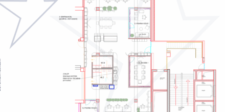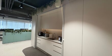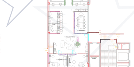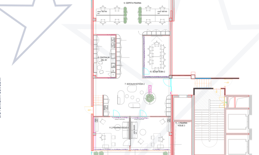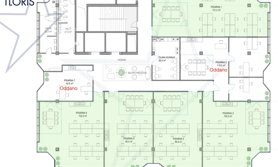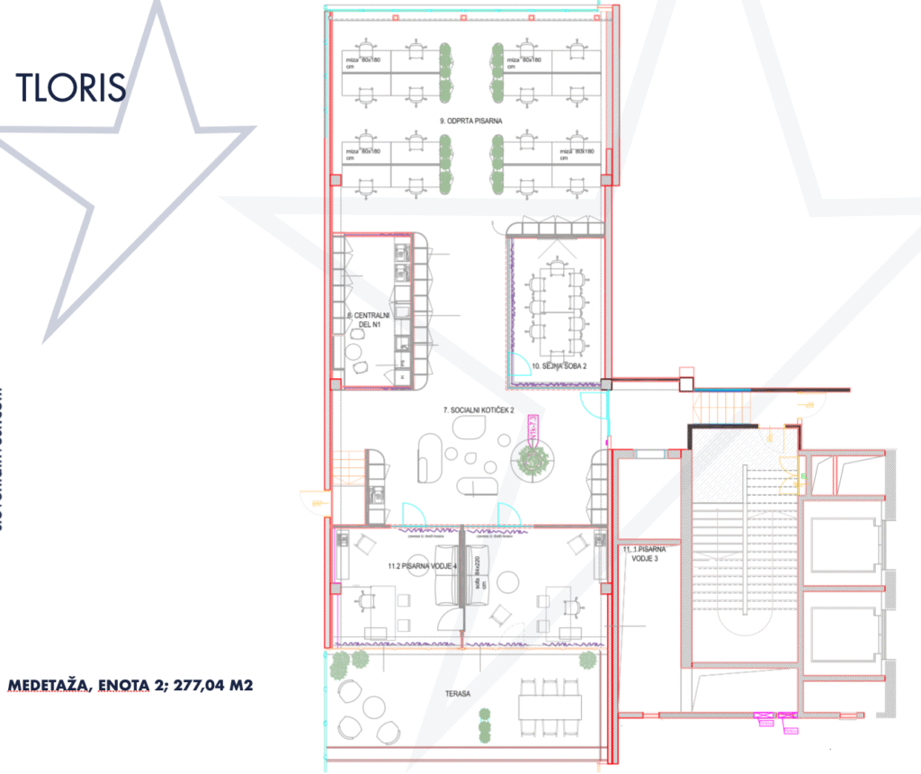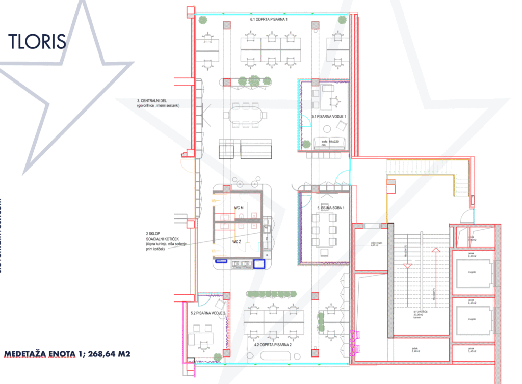 - ENOTA 2 v velikosti 277,04 m2, vsebuje konferenčno sobo, ločene pisarne in kuhinjo.