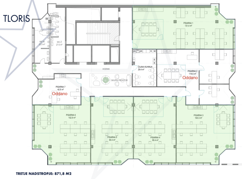 Površina vseh pisarniških prostorov na voljo skupaj znaša cca. 2.974m2.