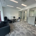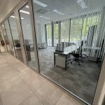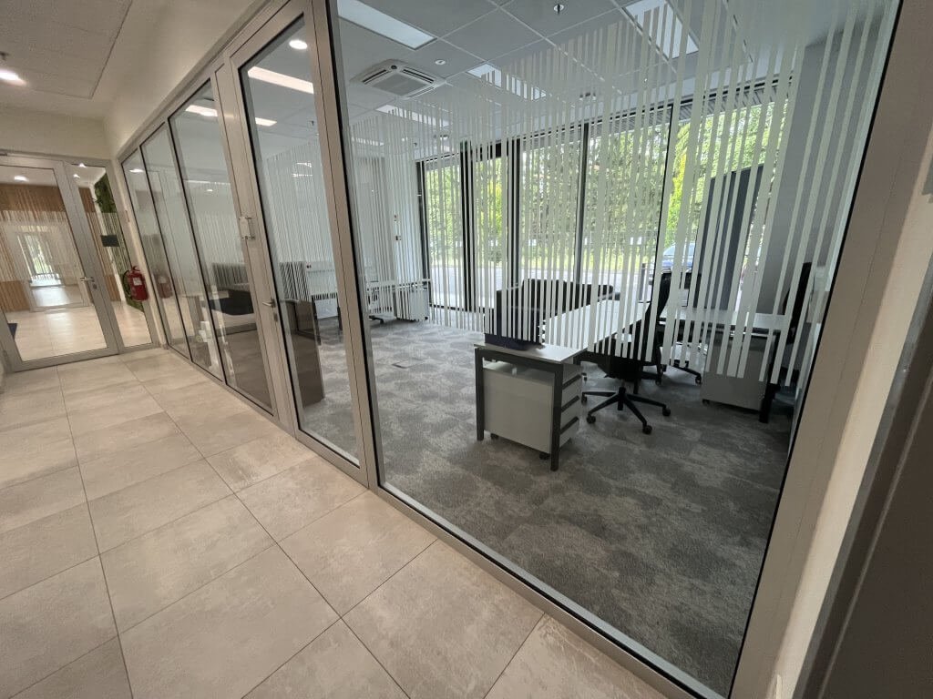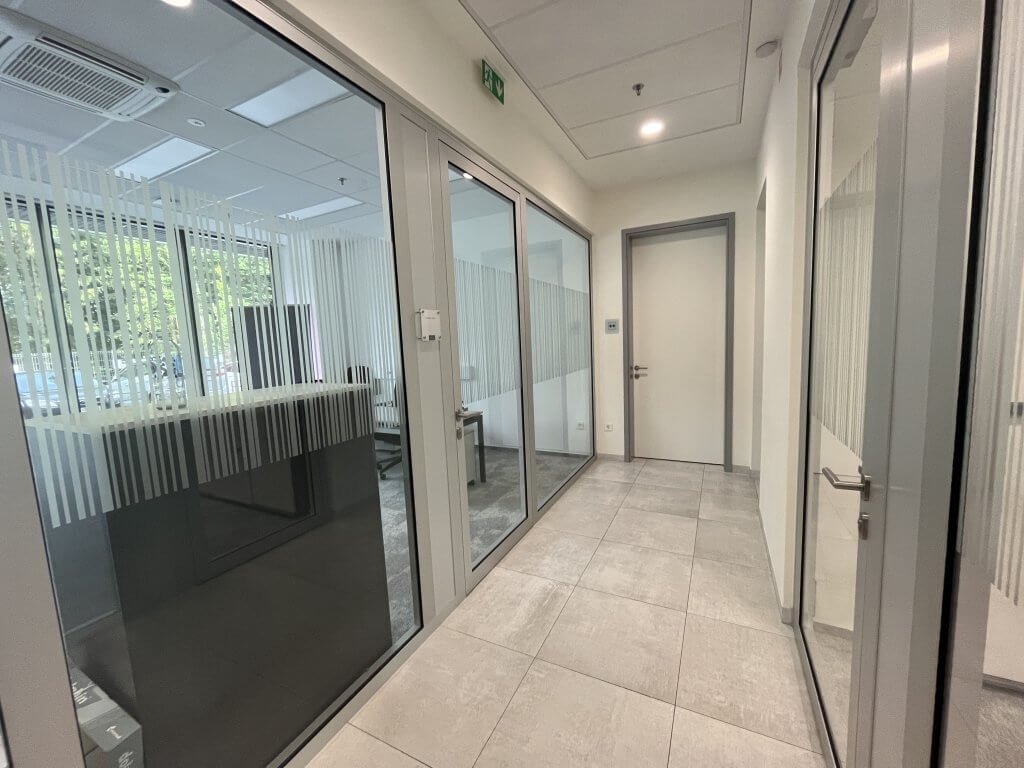 Pisarna se nahaja v pritličju levo od recepcije. V prostoru sta klima in prezračevanje. Vstop v pisarno je iz preko recepcije in hodnika, izhod je možen tudi direktno na parkirišče, na katerega je razgled iz pisarne.