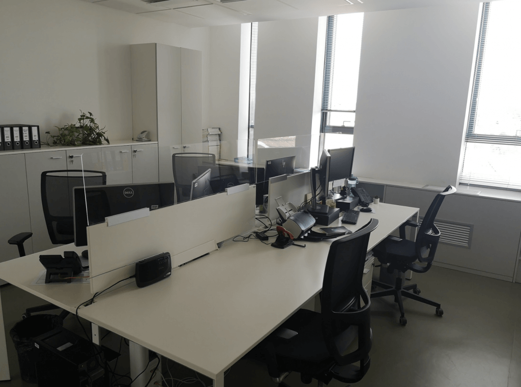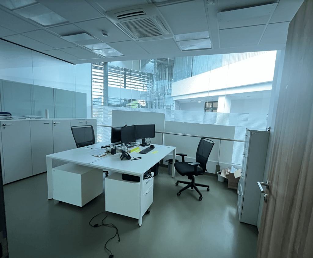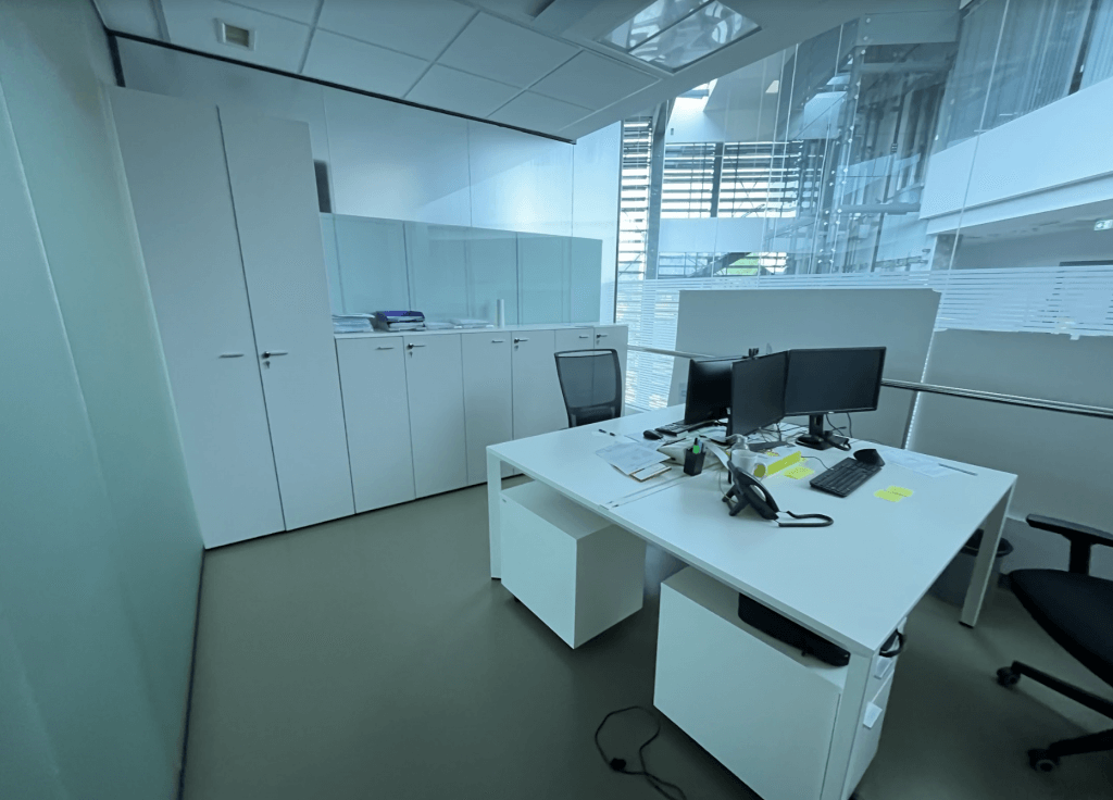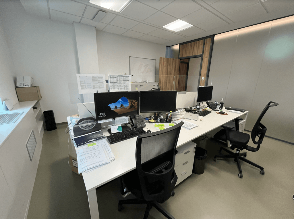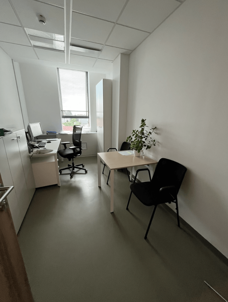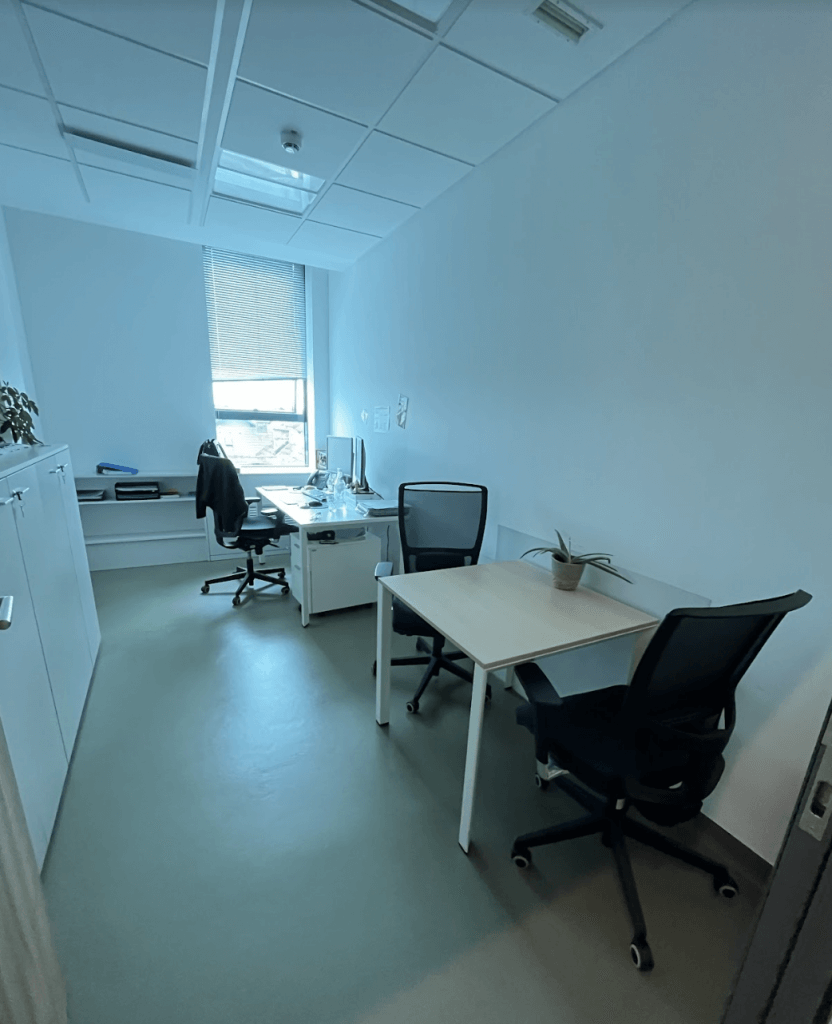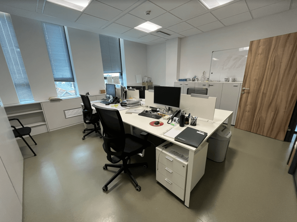 - Pisarna v velikosti 17,29 m2 (za 2 delovni mesti), sorazmerni del površine pripadajočih skupnih prostorov je 10,41 m2, torej skupna površina za najem znaša 27,70 m2.